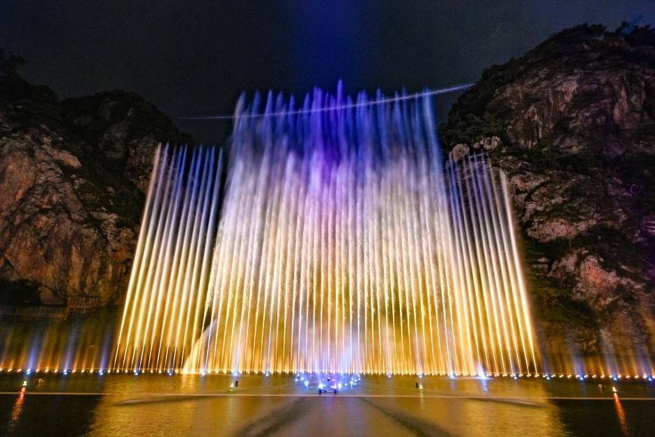 - 소금산 절벽을 배경으로 펼쳐지는 대형 음악분수 쇼입니다.