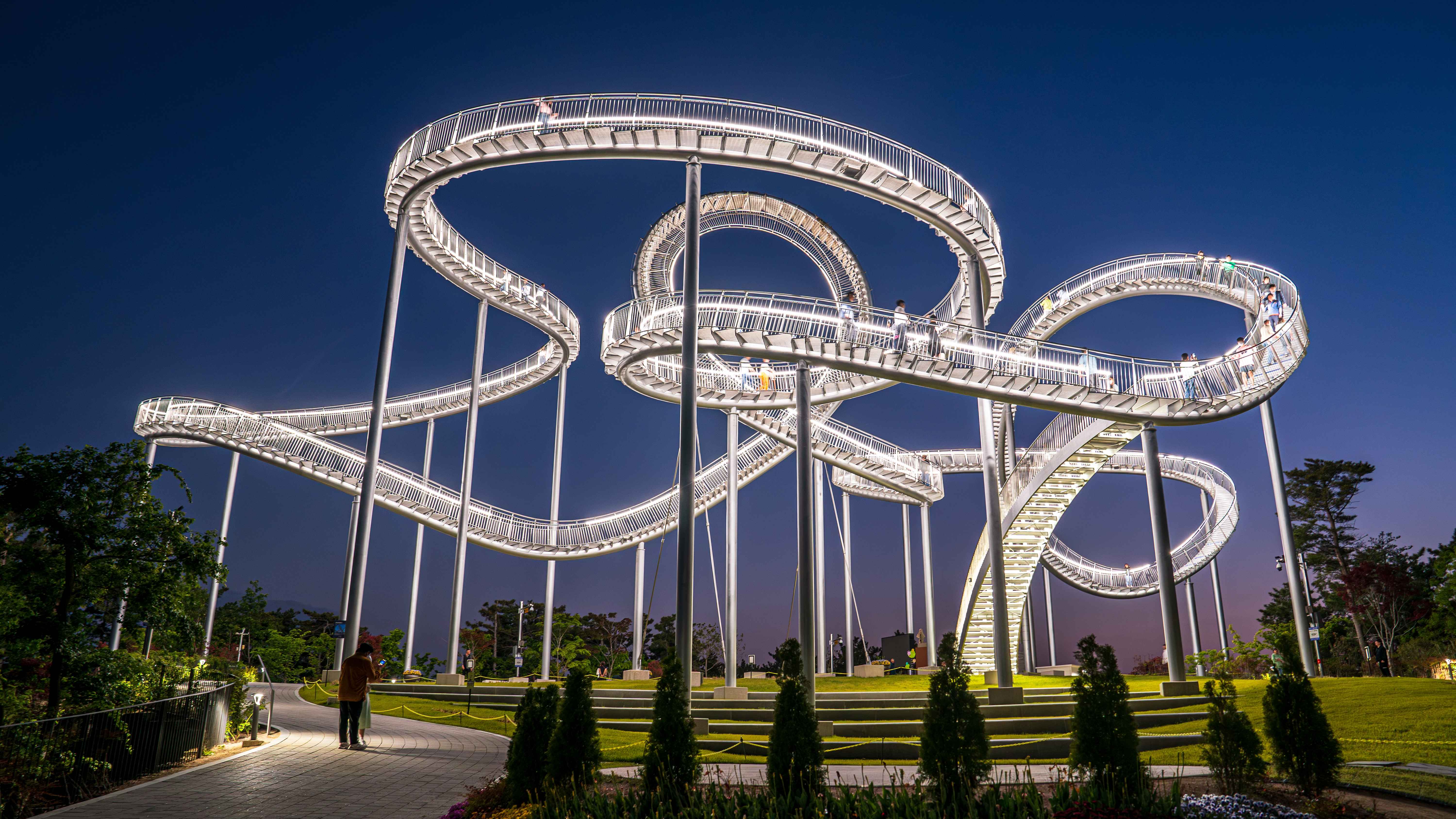 포항 환호공원에 위치한 스페이스워크(Space Walk)는 걸어 올라가는 조형물이자, 예술적 감각이 더해진 체험형 전망대입니다. 우아한 곡선 구조는 마치 하늘을 유영하는 듯한 인상을 주며, 정상에 올라서면 탁 트인 포항 바다와 도심 풍경이 한눈에 들어옵니다.