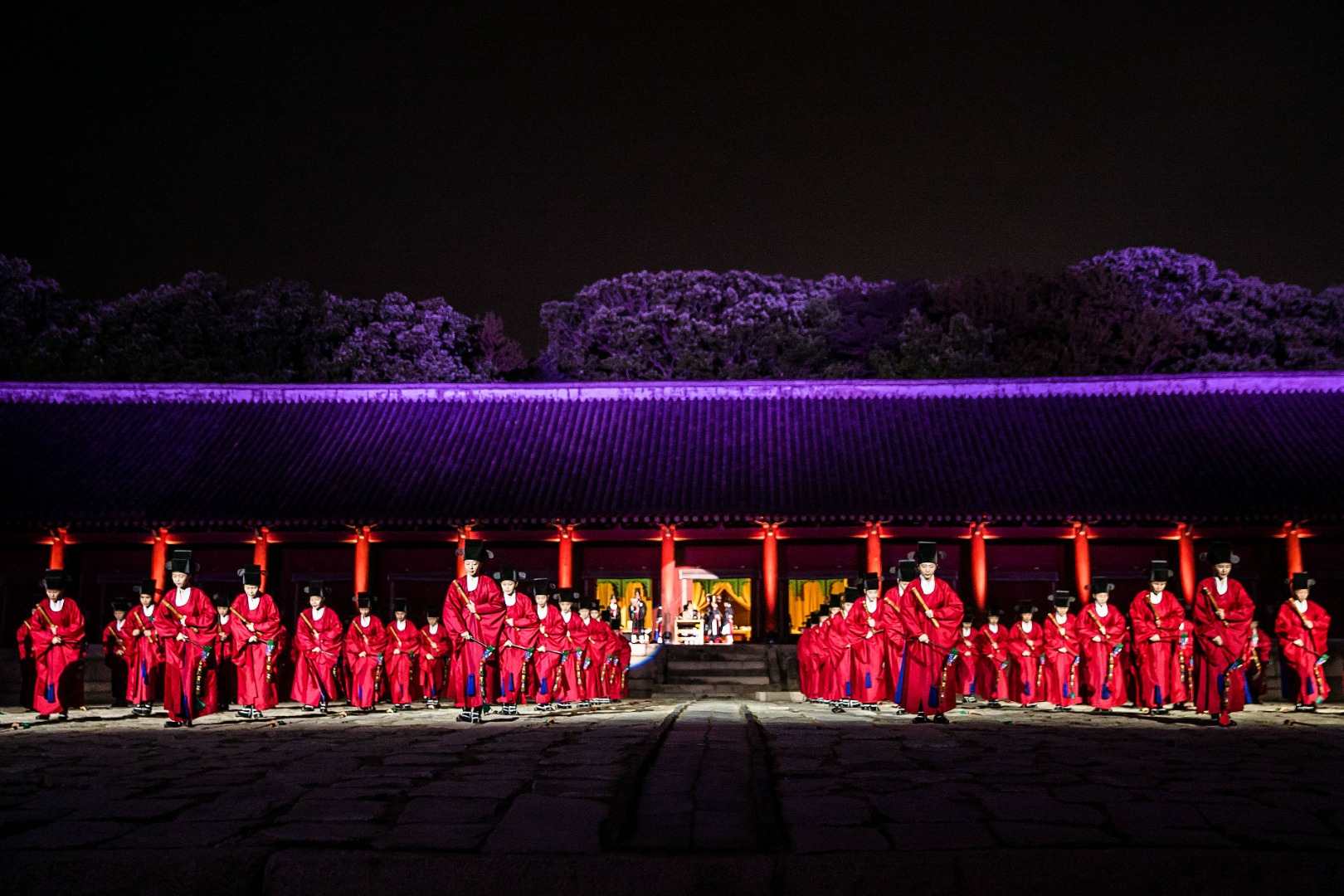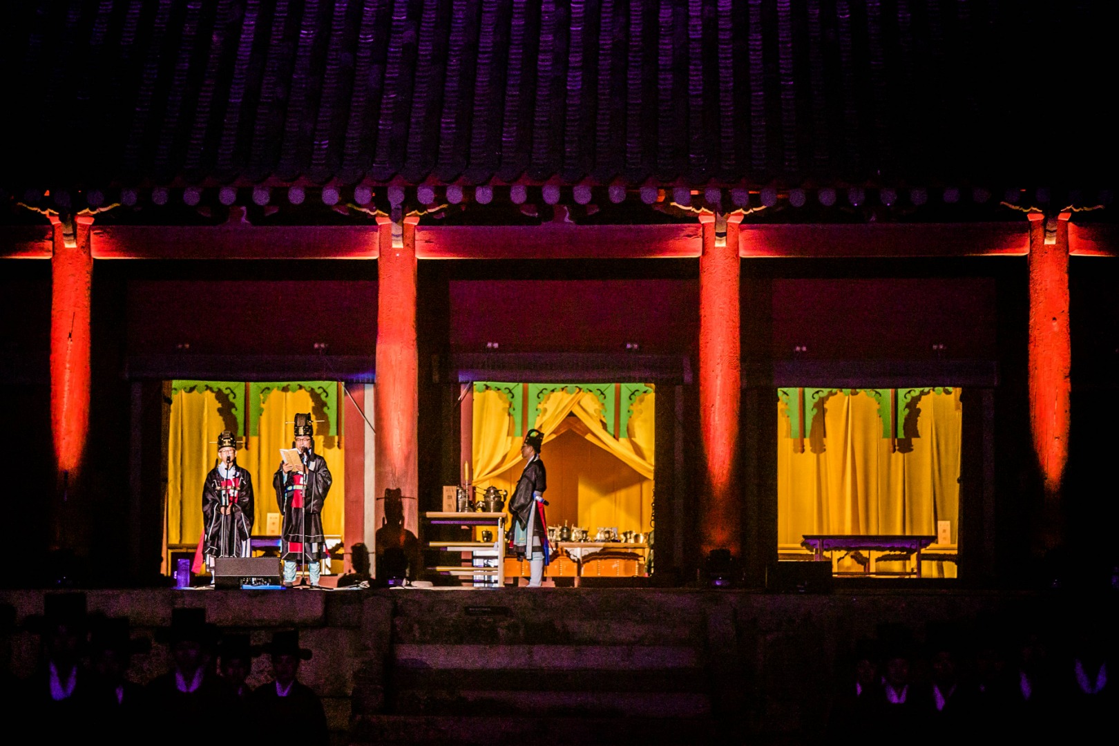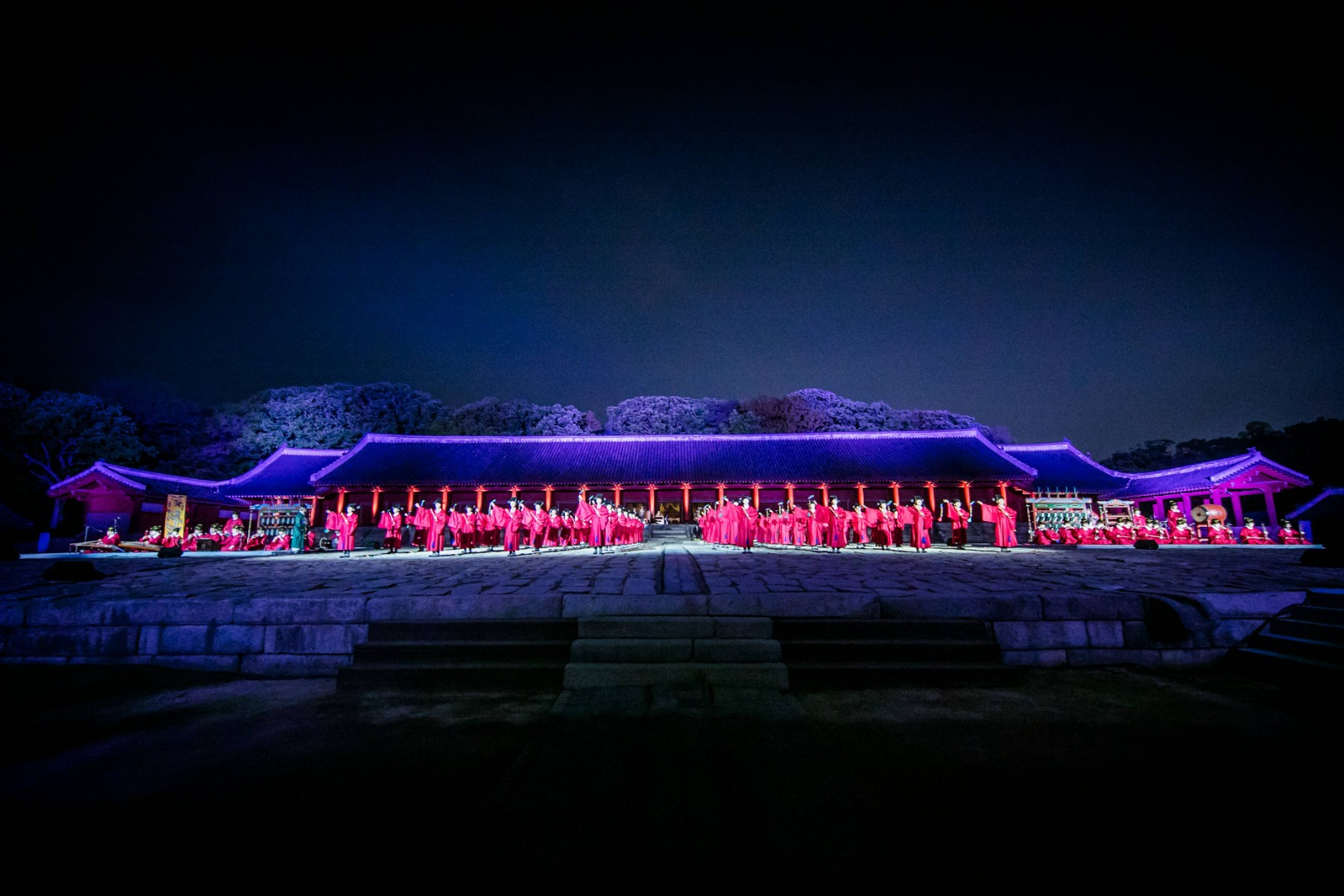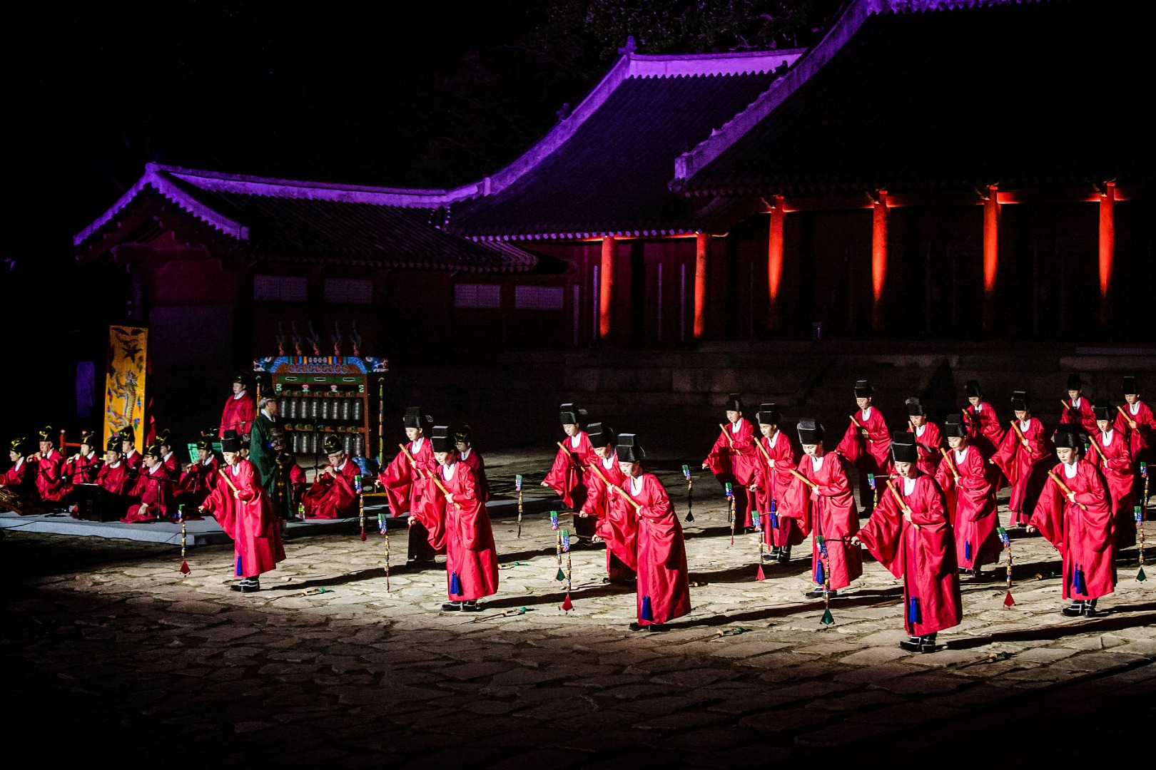 야간에는 종묘 건축물과 공연 공간이 은은한 조명으로 밝혀져, 조선시대 궁중의 분위기를 극대화합니다. 전통 조명 설치와 더불어 공간 전체가 한 편의 역사극 무대처럼 꾸며지며, 관객은 마치 조선의 밤으로 시간여행을 떠난 듯한 기분을 느낄 수 있습니다.