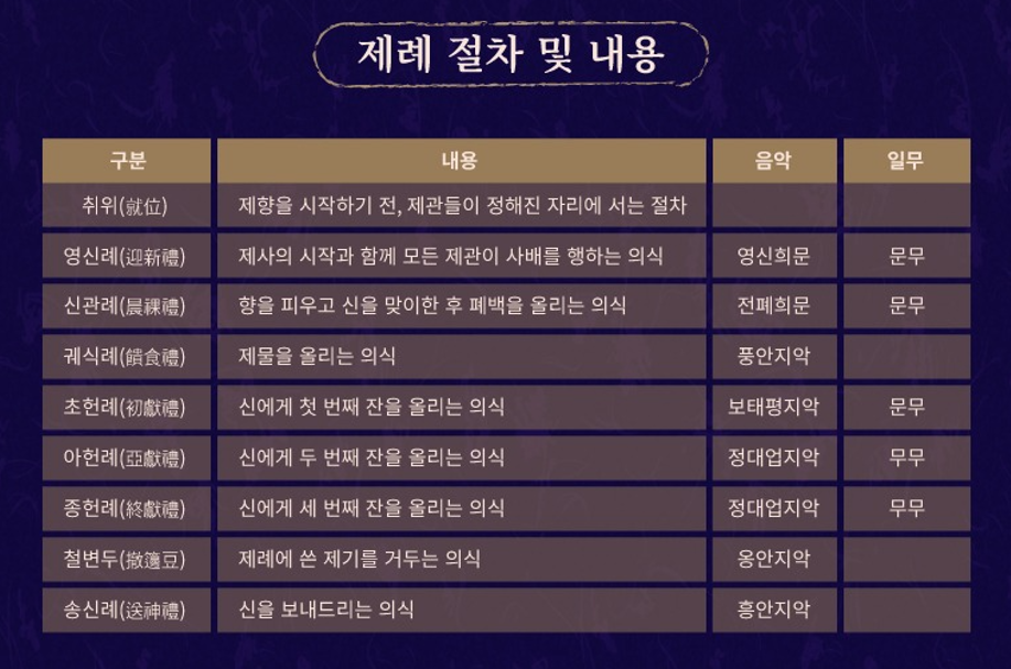 - 악(樂): 제례에 사용되는 음악으로, 아악(雅樂)과 정재(呈才, 궁중무용)로 구성