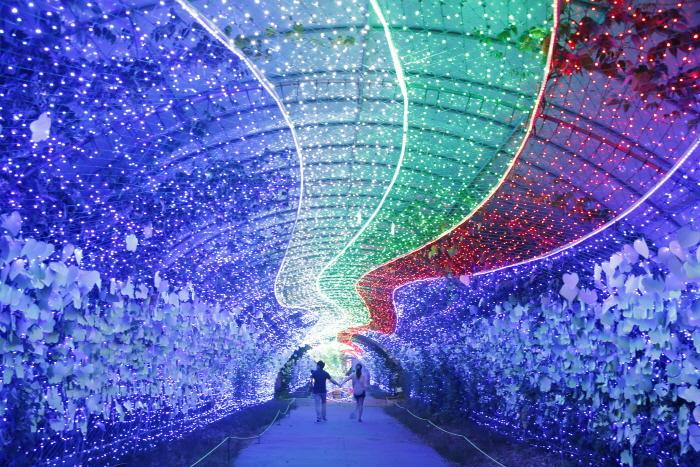 수만 송이 LED 꽃들이 펼쳐진 빛의 정원은 축제의 하이라이트입니다. 튤립, 해바라기, 장미, 수국 등 계절을 상징하는 꽃 모양의 조명이 환상적인 분위기를 자아냅니다.