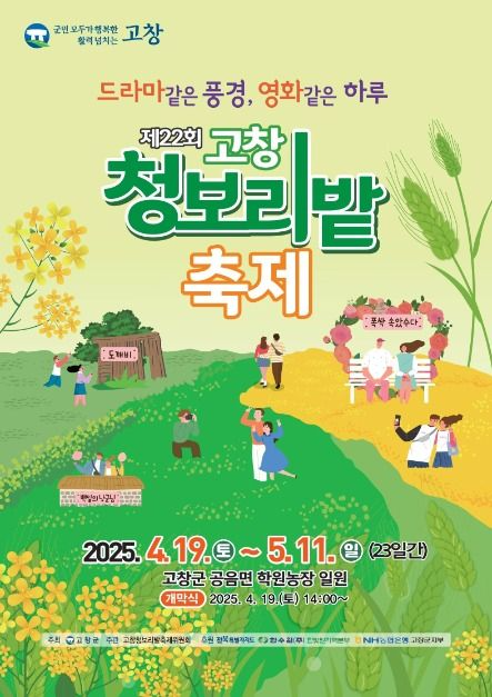 전라북도 고창군, 한적한 시골마을에 자리한 '고창 학원농장'은 매년 봄이 되면 초록의 청보리로 물결칩니다. 2004년부터 시작된 '고창청보리밭 축제'는 지금까지 20년이 넘는 세월 동안 전국의 봄 여행자들을 불러모으며, 고창의 대표적인 봄 축제로 자리 잡았습니다. 이번 포스팅에서는 2025년 고창청보리밭 축제의 전체 일정, 볼거리, 즐길 거리, 그리고 직접 느낀 감성 가득한 후기까지 생생하게 전해드립니다.