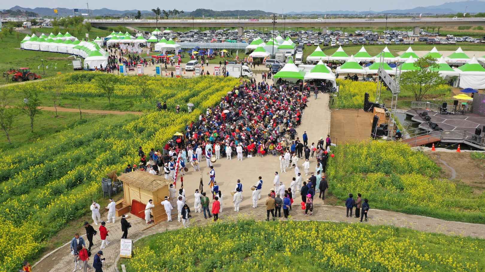 노란 유채꽃이 물결치는 꽃밭에서는 누구나 인생 사진을 남길 수 있습니다. 약 3만 평 규모의 유채꽃밭이 세도천 일대를 따라 조성되어 있어 산책하기에도 좋고, 드론 촬영용 포인트도 별도로 마련되어 있습니다.
