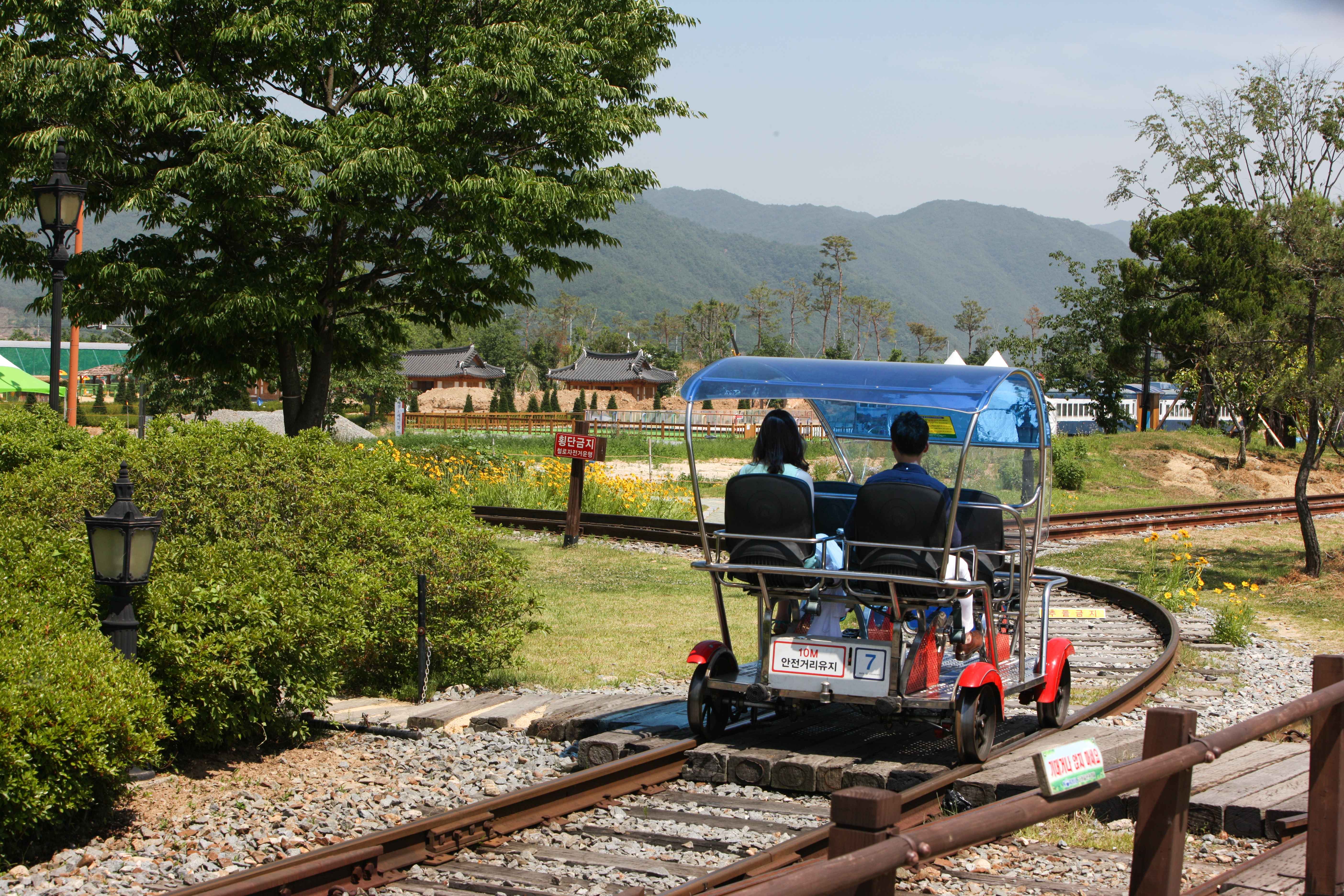잔잔한 숲길을 느끼고 싶다면 기차마을 레일바이크를 추천드려요.