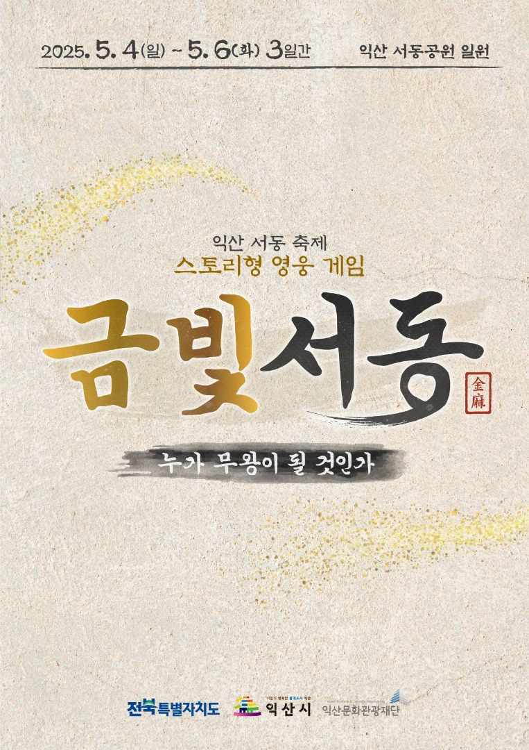 2025년 5월 4일부터 5월 6일까지, 전북 익산시 서동공원 일원에서 특별한 체험형 축제가 펼쳐집니다. 바로 금빛서동 - 누가 무왕이 될 것인가입니다. 이 행사는 서동설화와 서동요를 테마로 구성된 오프라인 RPG 게임 형식으로, 참가자가 직접 주인공이 되어 익산 곳곳을 누비며 다양한 미션을 수행하는 색다른 경험을 제공합니다. 역사와 전통, 그리고 스토리텔링이 결합된 이번 축제를 지금부터 자세히 소개합니다.