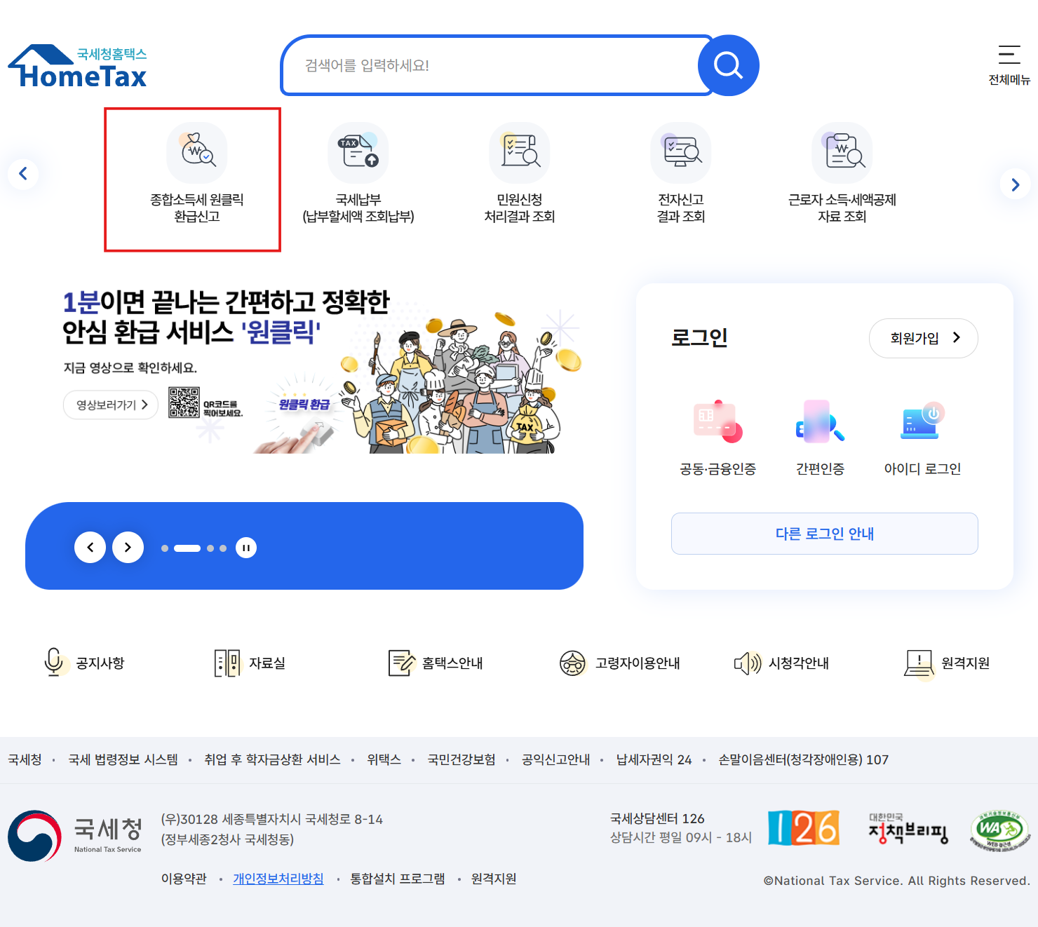 - 메인 배너에서 ‘원클릭 환급 신고’ 클릭