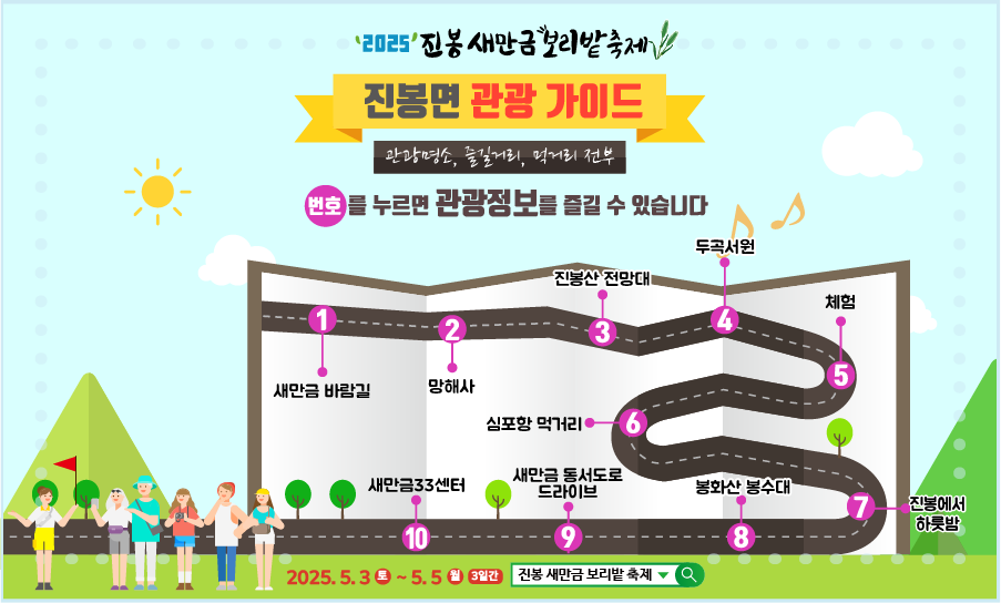 2025 진봉새만금보리밭축제는 자연, 예술, 체험이 어우러지는 봄철 힐링 축제로, 가족은 물론 연인, 친구 단위 여행객 모두에게 만족을 선사할 행사입니다. 초록으로 물든 김제 평야에서 특별한 봄날의 추억을 만들어보세요. 진봉의 따뜻한 환대와 풍성한 프로그램이 여러분을 기다립니다!