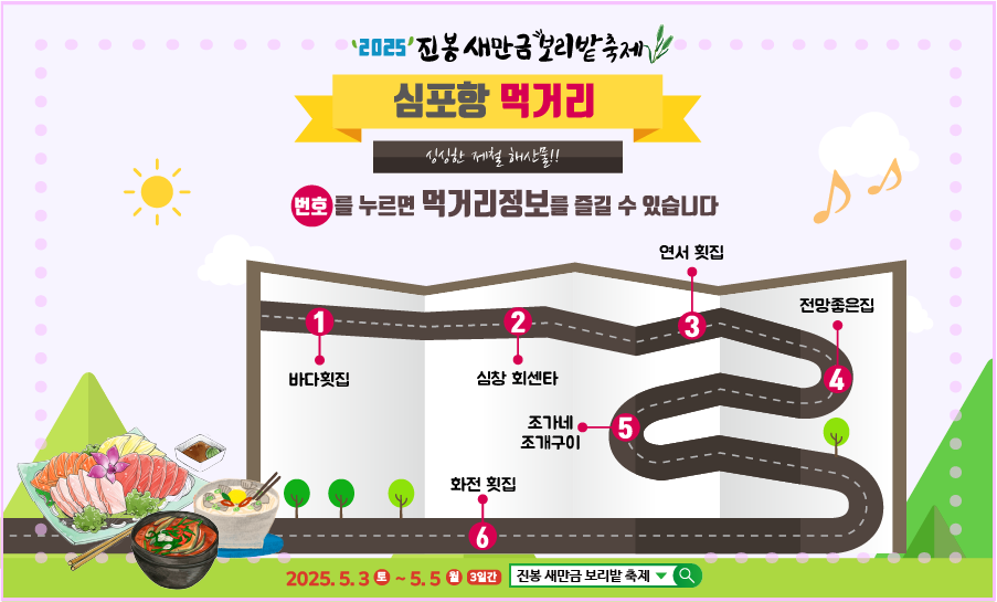 - 먹거리 장터: 보리 요리부터 간식까지 현장에서 바로 즐길 수 있는 음식들