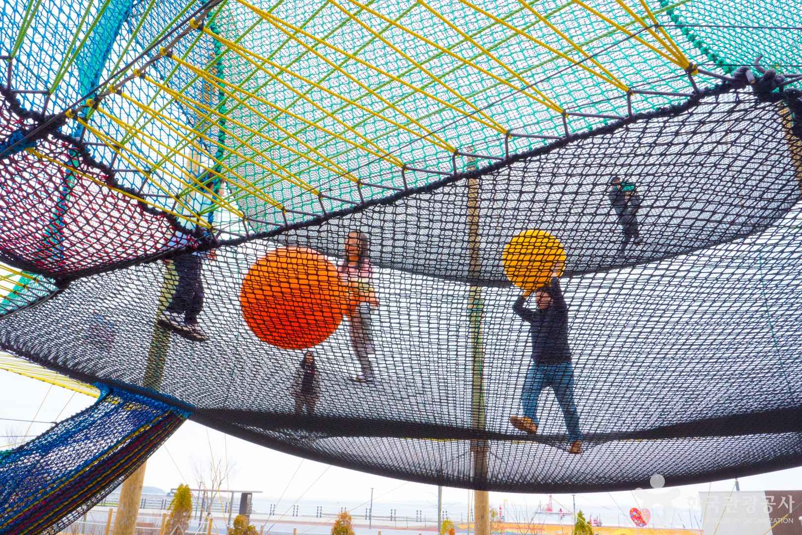 홍성 남당항 수산시장 바로 옆, 해양분수공원 끝자락에 위치한 네트어드벤처는 층층이 쌓인 색색의 그물 구조물이 인상적인 국내 최초 해양형 어드벤처 시설입니다. 프랑스 요트 선수 세드릭 쇼바우드가 고기잡이용 네트와 매듭 기법을 활용해 만든 독특한 공간으로, 아이들은 물론 어른들까지 꿈꾸던 해양 요새 속 모험을 실현할 수 있습니다.
