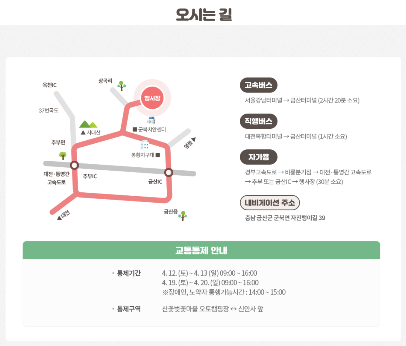 - 주차: 임시 주차장 + 셔틀버스 운행