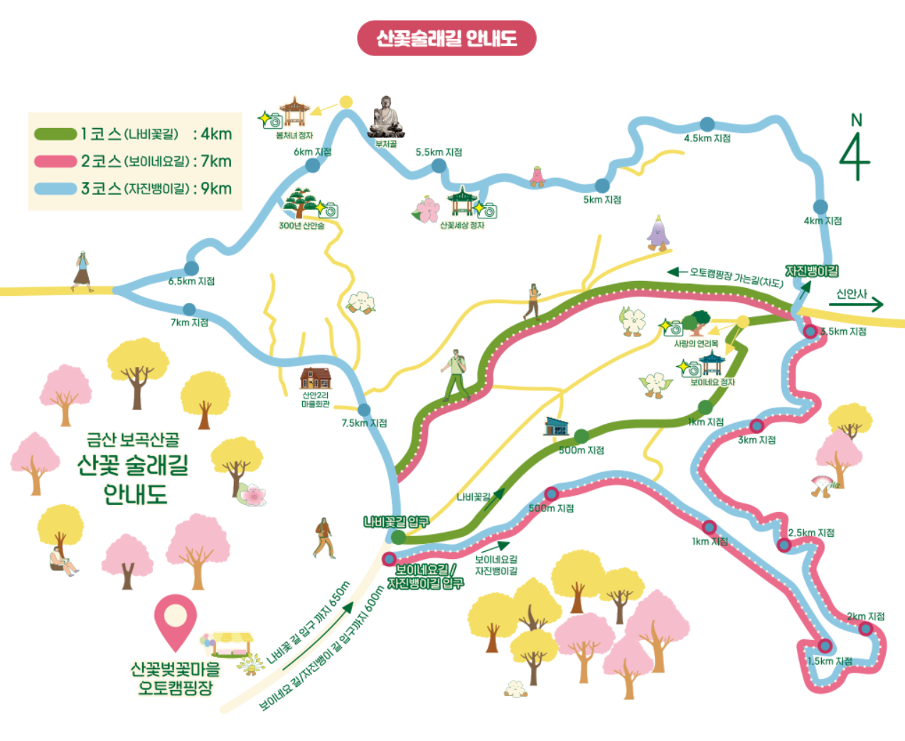 - 산벚꽃 힐링 산책 코스 자연과 동행하는 치유의 시간 보곡산골 내 조성된 힐링 산책로는 경사도가 완만해 남녀노소 누구나 걷기에 부담이 없으며, 곳곳에 설치된 벤치와 포토존에서 자연의 아름다움을 감상하며 휴식을 취할 수 있습니다.