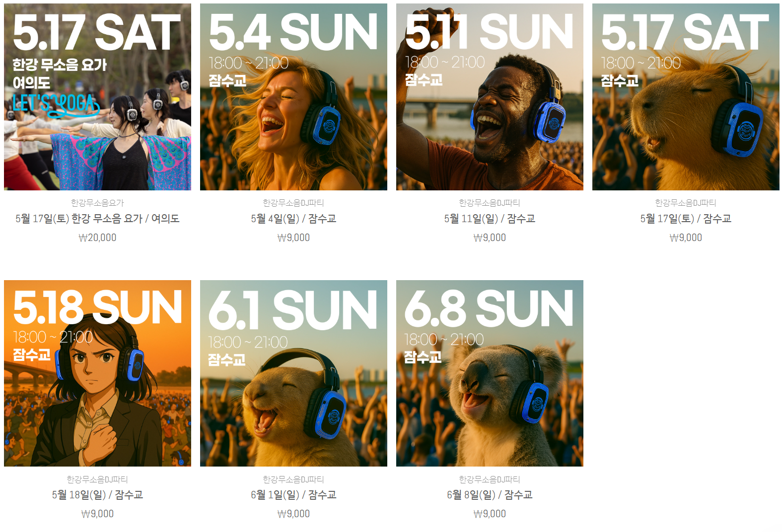 - 무소음 디제잉: 헤드셋을 끼고 즐기는 색다른 파티. 특정 일자에 진행됨.