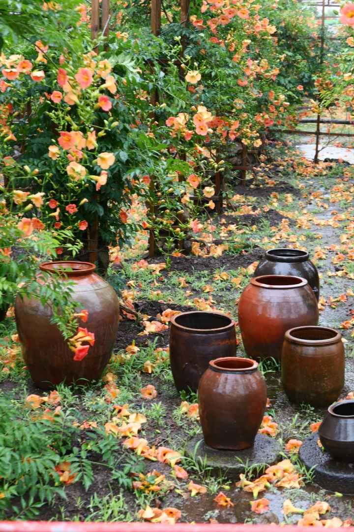 - 포인트: 아치형 능소화 터널, 돌담길 능소화 그늘길, 푸른 잔디 배경 능소화