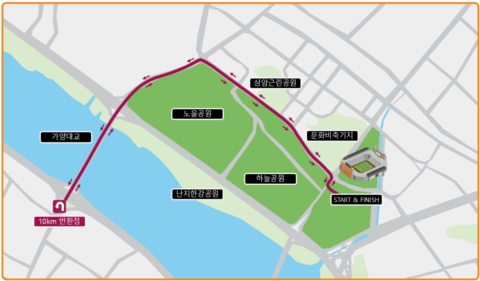 ※ 실제 거리는 약 11km이며, 월드컵경기장 사거리 인근에서 10km 기록을 측정하여 제공해드립니다.
