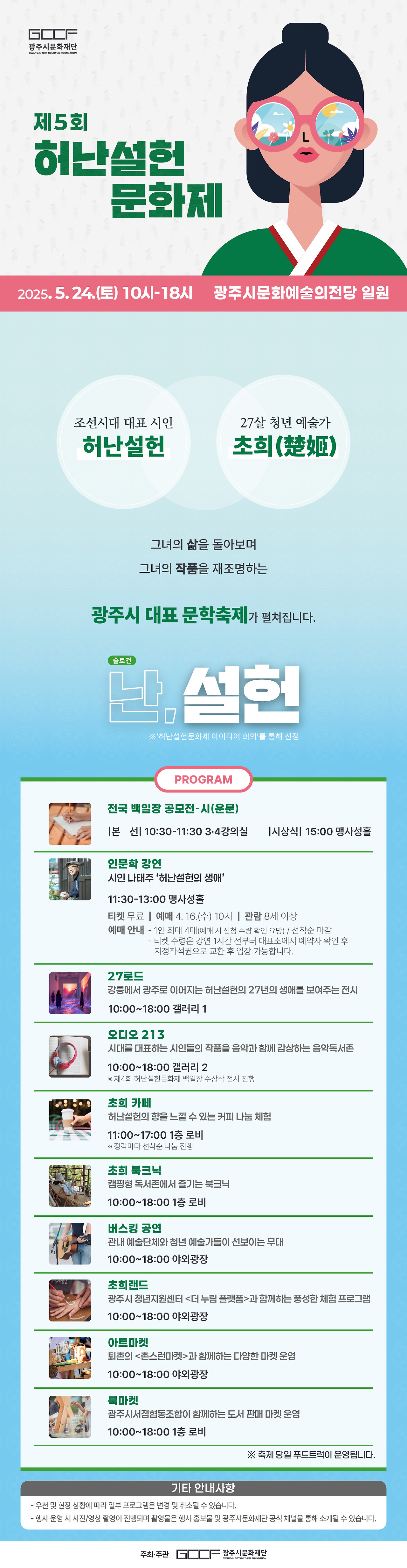조선시대의 천재 여류 시인, 허난설헌. 그녀의 삶과 시 세계를 재조명하는 문화예술축제인 2025 허난설헌문화제가 오는 5월 24일, 단 하루 경기도 광주에서 개최됩니다.