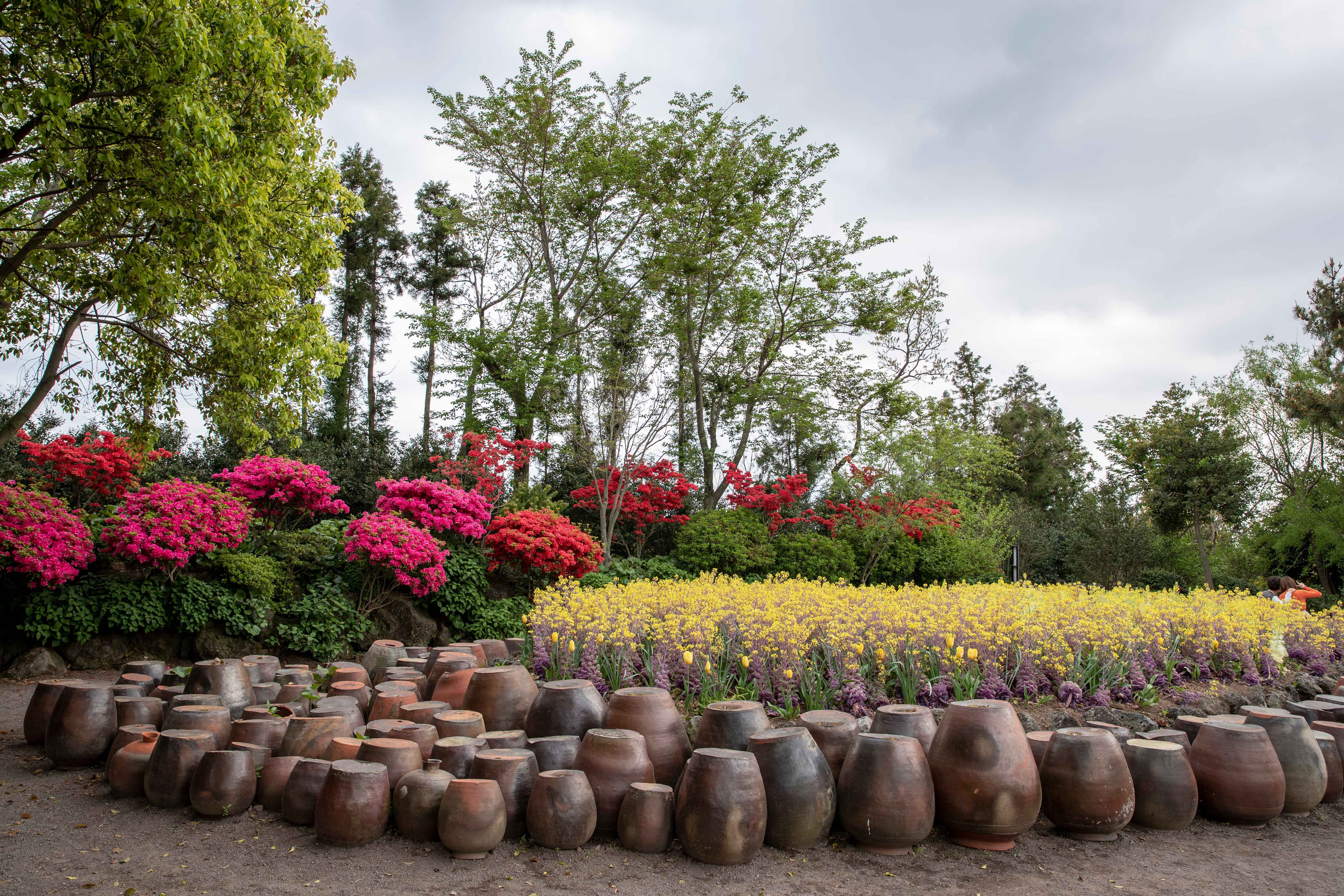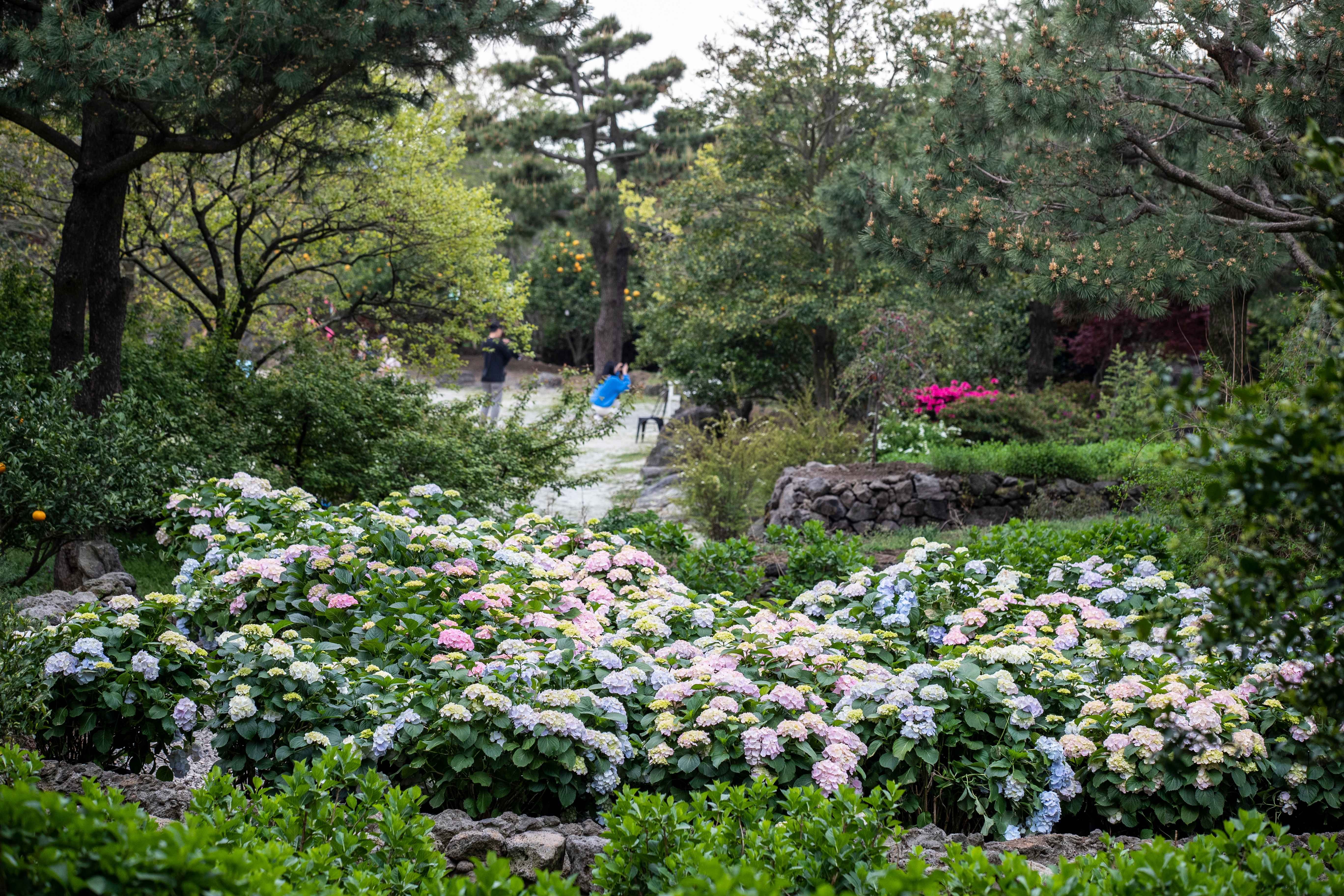 제주의 전통 정원 양식을 그대로 살린 돌담길은 수국과 어우러져 고즈넉한 분위기를 자아냅니다. 한국적인 배경에 꽃이 어우러져 있어 감성적인 사진 촬영에 제격입니다.