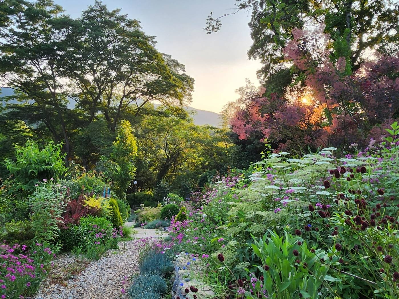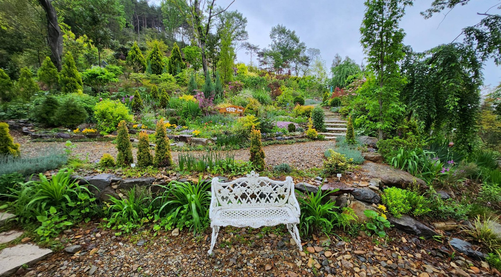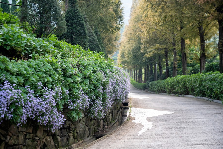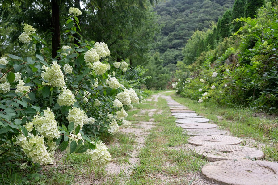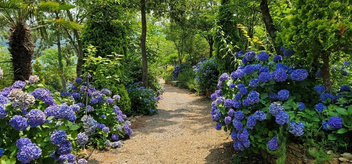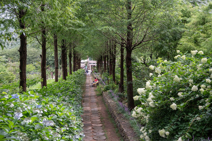 경남 고성의 그레이스정원은 ‘엄마의 꽃밭’으로 불리는 수국 테마 가든으로, 숲속 도서관, 메타세쿼이아길, 숲속 교회까지 감성적인 요소가 가득하다.